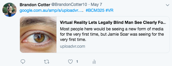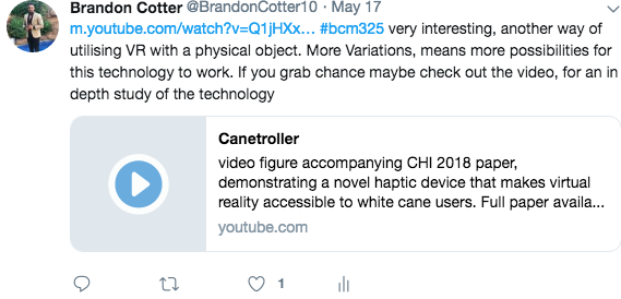 Over the last few weeks for the first time I created a Digital Artifacts. Throughout the DA I tried to highlight many areas of iterations and importance I’ve made during the course the weeks. The Conceptual idea for my DA was to try to speculate and in doing so highlight how the technology I’ve created “Sonar Reality” with real evidence, being able too assist those who are blind or visually impaired. I thought if the idea when I saw an ad online showcasing how hard it is to have a disability of some sought. This prompted in my mind, to do some research into areas I could improve on. Once I found an area that was well documented into having research but more so allowed me still some room to explore, I was able to conceptualized the idea of Sonar Reality. I went into great lengths in my blogs to showcase further information that I’ve read into each post. Not only does each post have my breakdown of the area but further evidence exploring it as well in greater depth. I wanted this Blog website to be a area where you could find information as well links to other areas to help further research into the curing the blind. This would benefit the social utility of people who are blind or researchers whom are looking for information as well. I found success in gathering information, as there is so much about each individual technology, however it was evident that it each one had to be carefully articulated to work coherently. I found it hard too keep up too date with anything new, also making sure I don’t repeat the same information I’ve spoken about already. More so I made few variations and iterations to my DA blog from the comments from peers. I tried to answer questions they provided in terms of military use of Sonar Technology, but also the negative affects if my technology was too break. Also I wanted my information being concise and easy too read, so people didn’t have to spend a day finding critical information. When I first approached the future cultures DA challenge I was on new ground. Trying to find the right medium and concept to allow me to explore a technology that will shape the future really intrigued me. As it raised the question of how do I create something different but relatable in someway. Overall I really enjoyed this class and assignment, it made me look into areas id never thought id be exploring. More so I was able to contract ideas of how the world will be in terms of society. I feel I challenged myself to do research but also to address the future of the world. At the end of the day the students of bcm325 are the future of the world, meaning some of these wild ideas may be used and come true in our lifetime.