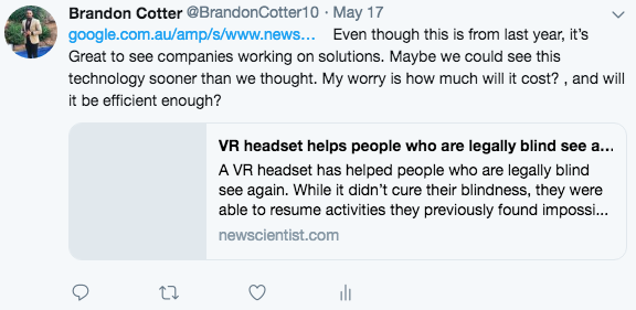 One concern that came up was what if the technology was too turn off or go dark on the person wearing it. Wouldn’t it leave them stranded and helpless? Yes, however through my research I’ve discovered a back up mechanism that will allow the person be able to help the those who are visually impaired. I’ve looked into an additional small monitor that sits on your hand, this monitor users a vibration system too help located the nearest door or equipment needed for the headset. But the most important kit, if the person is isolated the wrist monitor has buttons in brail that sends out a pulse that allows distress calls for help. (https://nei.nih.gov/news/briefs/five-innovations-harness-new-technologies-people-visual-impairment-blindness ).